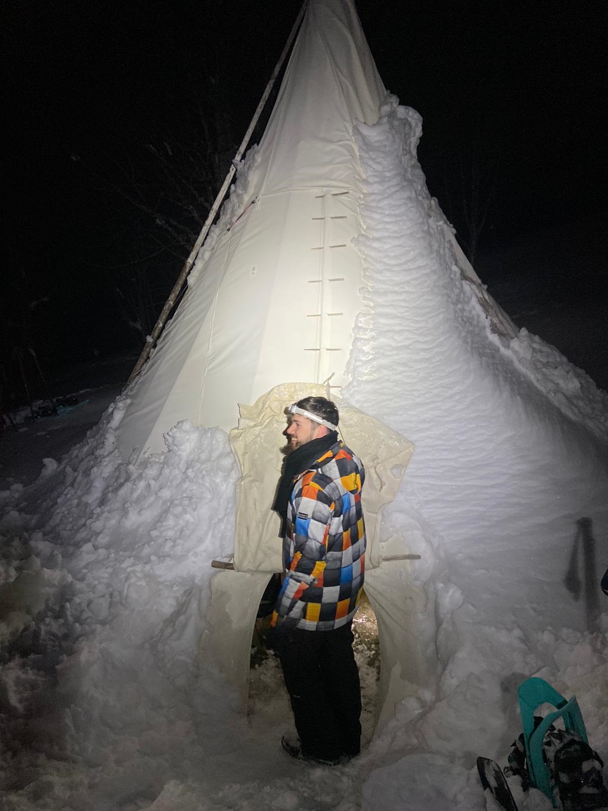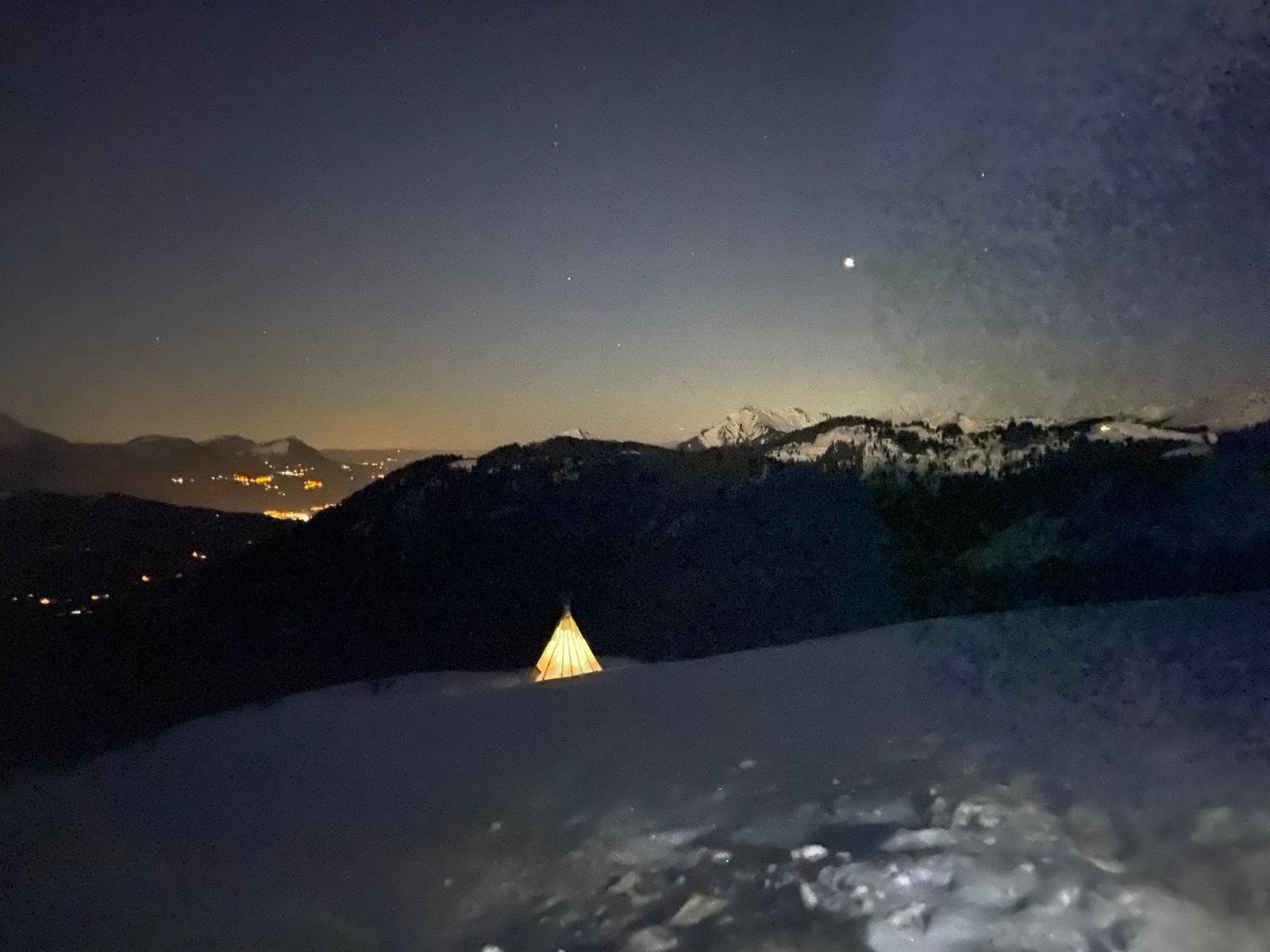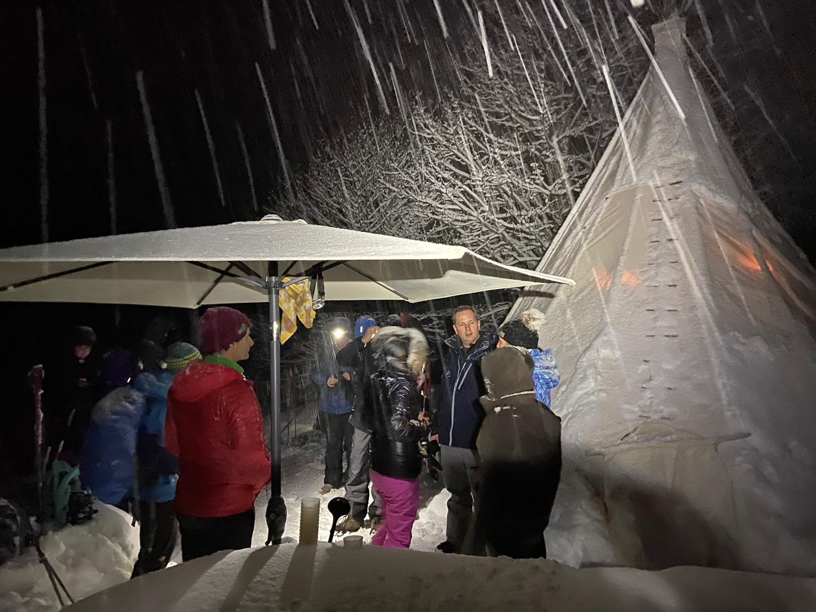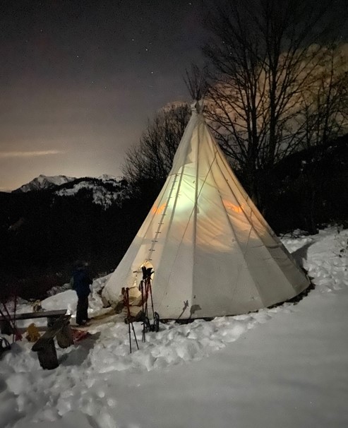 Een nachtelijke benaderingstocht op sneeuwschoenen, gevolgd door een gezellige Savoyaardse maaltijd in een Indiaanse tipi.