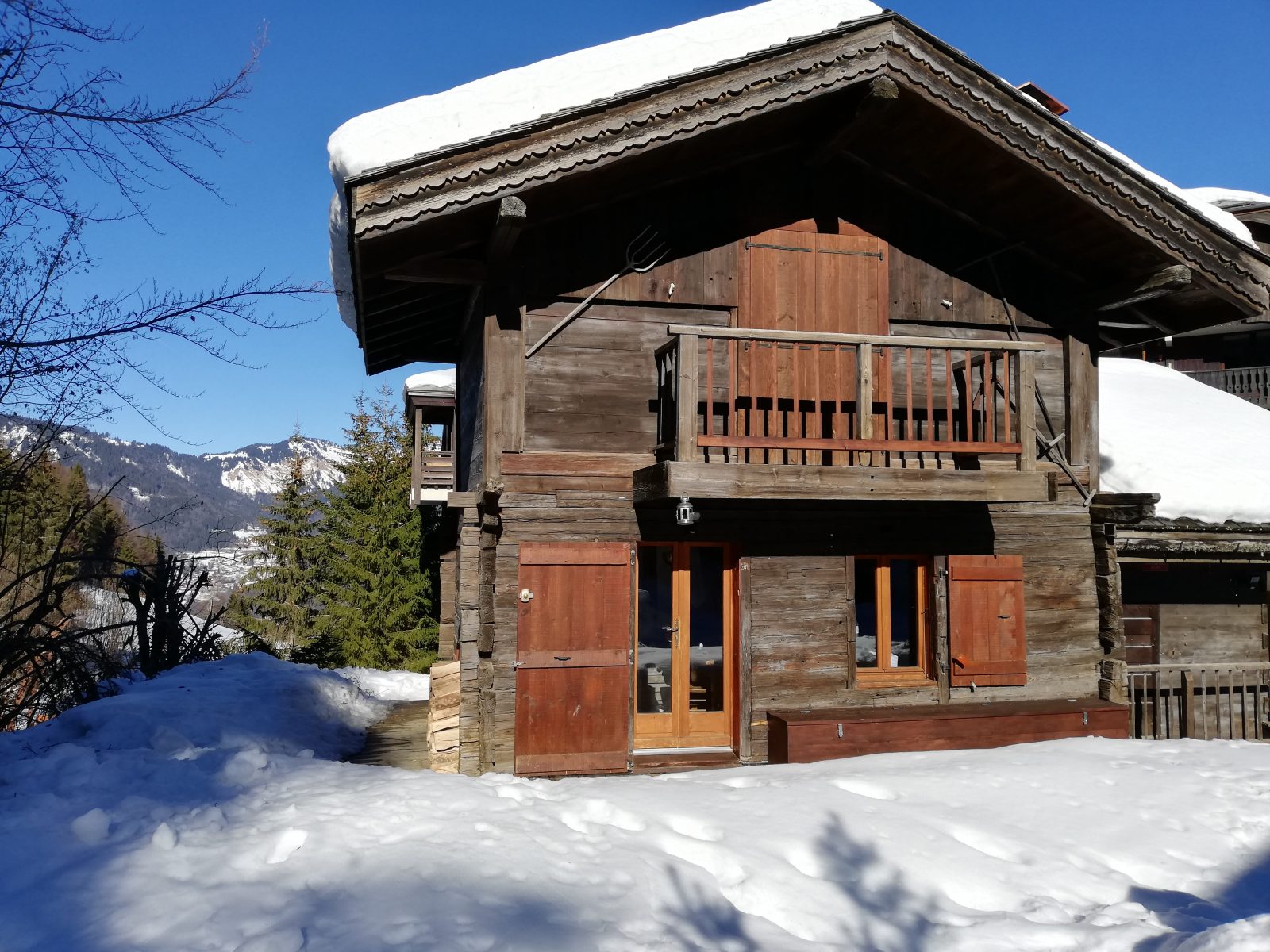 Charmant chalet te huur aan de voet van de pistes, bestaande uit een dubbel houten mazot met een oppervlakte van ongeveer 70m2.