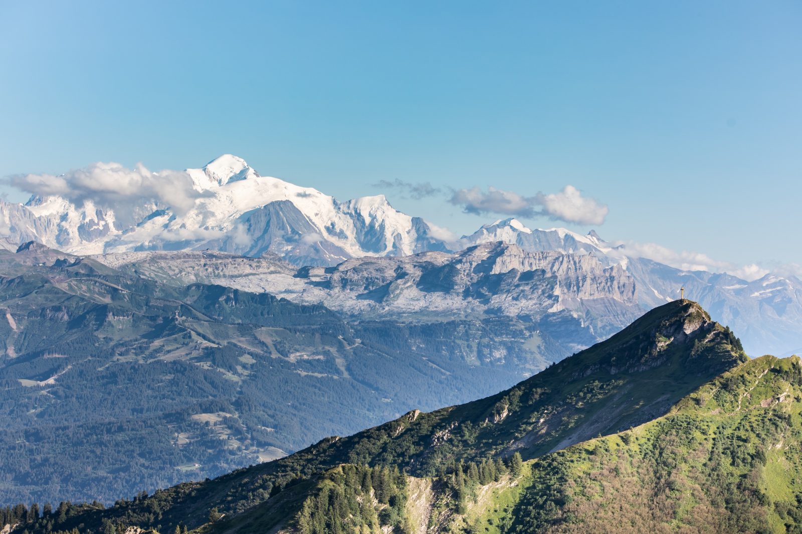 Een parcours door het middelgebergte met bijzondere uitzichten op de omliggende dalen en bergen: Mont Blanc, Jura, Bornes-Aravis...