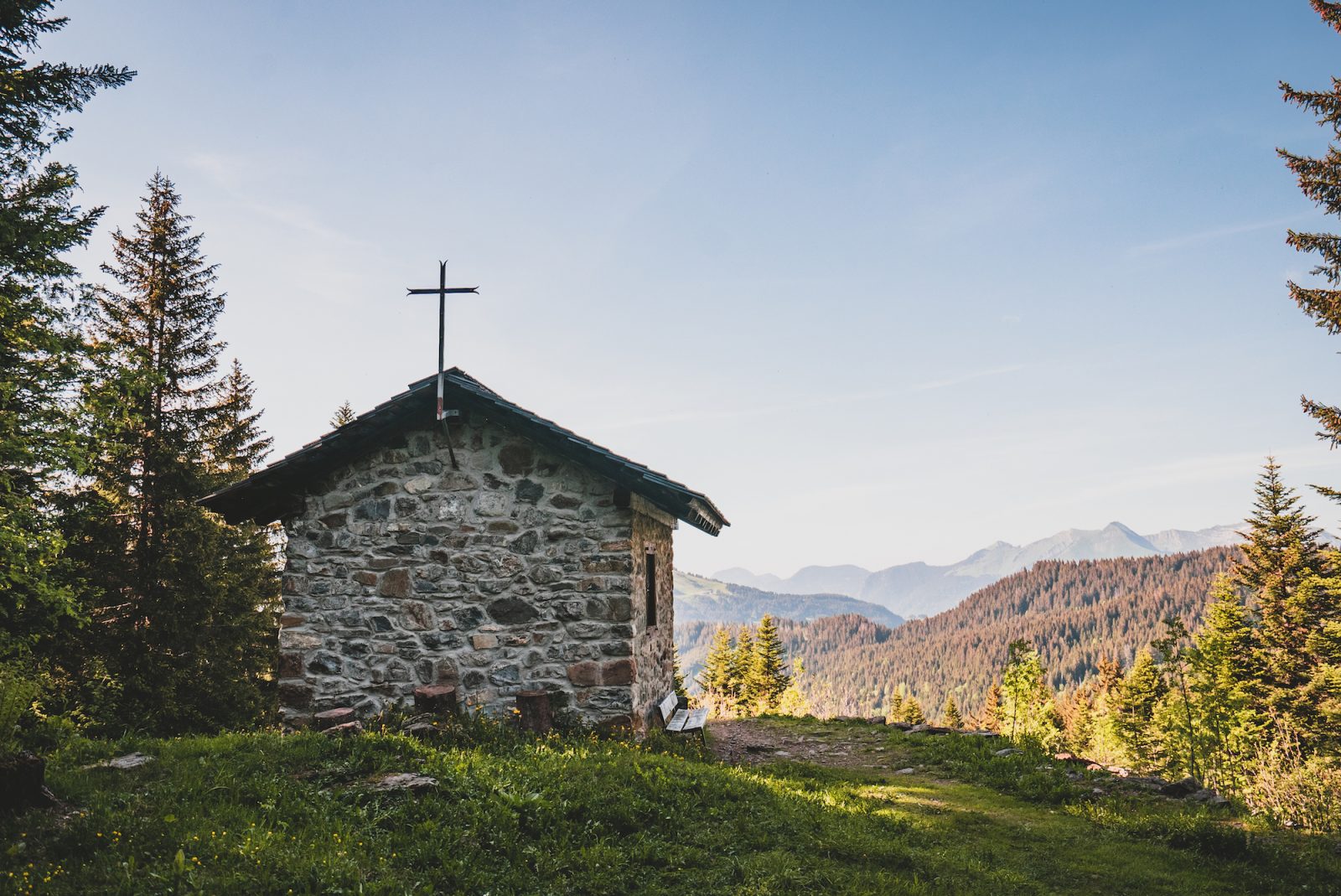 De geschiedenis van deze kapel begint in 1313, toen de drie gemeenten van van Les Gets, Taninges en Samoëns besloten om de grenzen van hun hun grondgebied. Wat de grenzen van het Loex-plateau betreft, werden de grenzen niet aanvaard en werd een perceel met de naam "Loex" niet aanvaard. worden niet geaccepteerd en een stuk land genaamd "le Sax de Jacquiert Curt" wordt wordt begeerd door de 3 partijen. Een proces begint dat zal duren... zal...366 jaar duren! In 1679 wordt het vonnis uitgesproken en wordt de gemeenschap in het midden van het beroemde perceel. De gemeente van Les Gets, dacht zijn zaak gewonnen te hebben, besloot een kapel te bouwen op het deel van de deel van het perceel dat aan haar was toegewezen. In juni 1679, begon het werk door een metselaar uit Samoëns. In de nacht van 14 op 15 Augustus van datzelfde jaar werd de bijna voltooide kapel afgebroken door door demonstranten. De daders zijn nooit gevonden. In de In de jaren '60 vonden de ONF-agenten de ruïnes. De burgemeesters van Les Gets, Taninges en Verchaix stelden voor om de kapel te herbouwen en de en de bevolking mobiliseerde om het weer op te bouwen. Van 1986 tot 1989, op de de huidige Jacquicourt kapel werd gebouwd op de fundamenten van 1679, en maakte zo een einde aan 6 eeuwen van conflicten.
